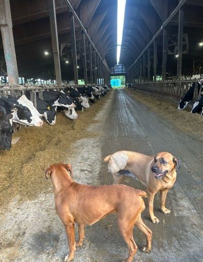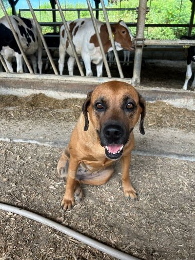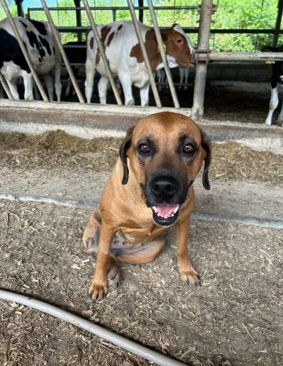 Brown Bear, a boxer mix, lives with his owners on a dairy farm that has been in their family for seven generations. Like most small farms, finances are very tight.
